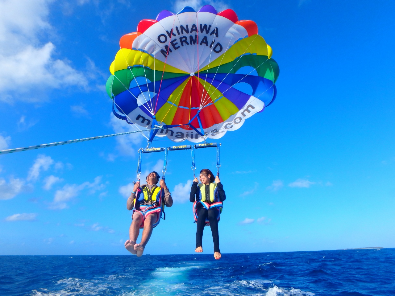 本島北部瀬底島パラセーリングとゴリラチョップでのマリンスポーツを