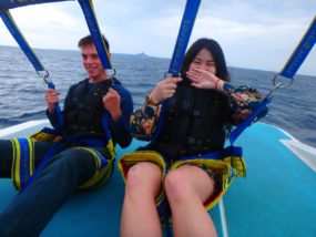 本島北部で開催されるパラセーリングは