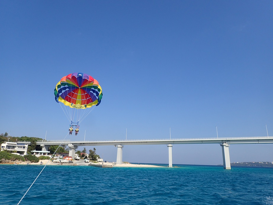 パラセーリングは瀬底大橋の近くで![]()